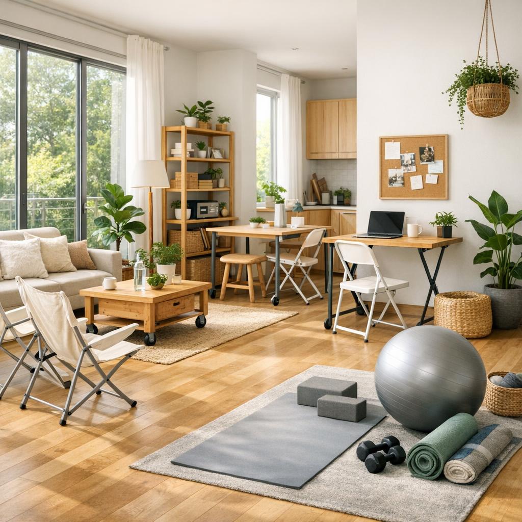 Ein urbanes Apartment mit offenen Wohnflächen, flexibel nutzbaren Möbeln und einem kleinen Fitnessbereich zeigt, wie viel Aktivität auf begrenztem Raum möglich ist. Pflanzen und helle Farben schaffen eine inspirierende Atmosphäre, die zu Bewegung einlädt.